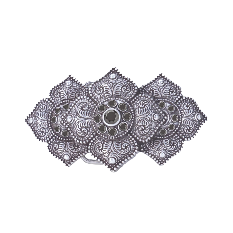 Boucle aux détails travaillés faisant pensé à une étoile. Chaque strass noir est pausé à la main par notre fabricant italien.